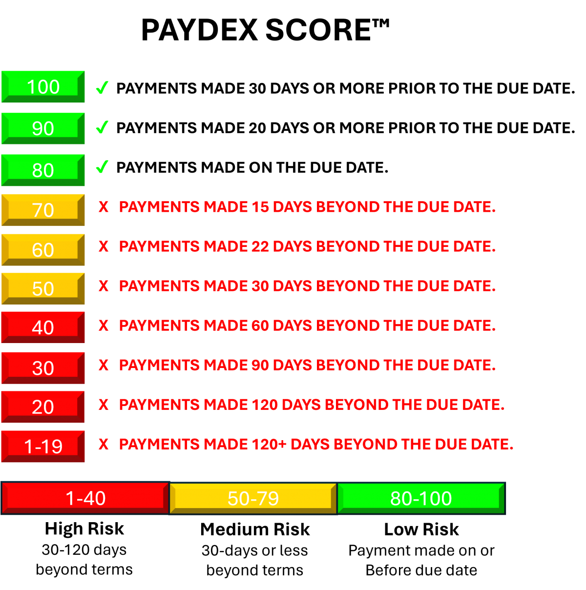 ✔ Industry Risk: The inherent risk associated with your industry can influence your score. Some industries are considered higher risk, which can impact your PAYDEX Score.